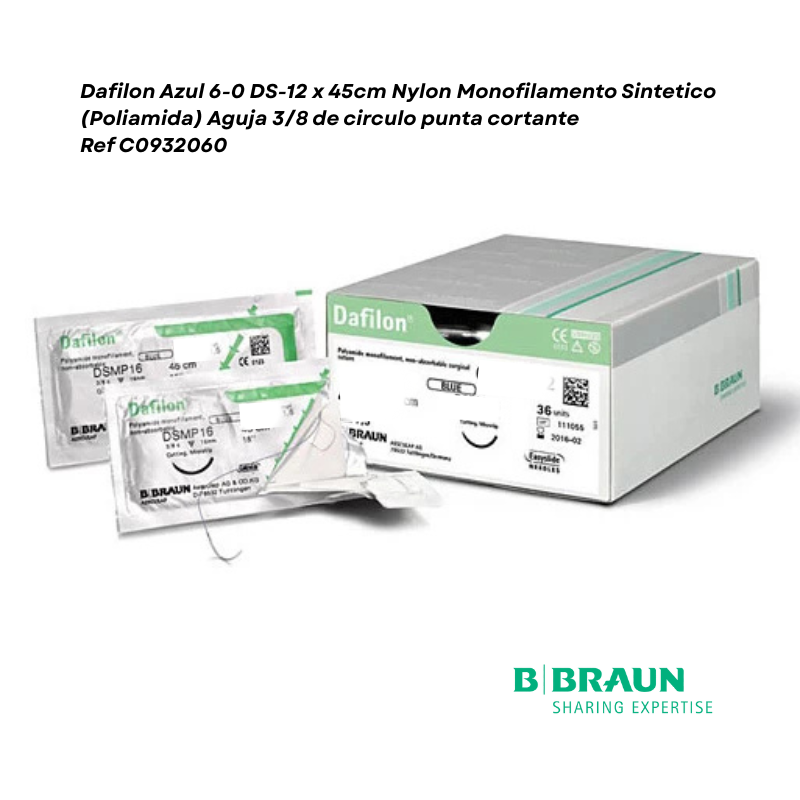 $ 168.500Dafilon Azul 6-0 DS-12 x 45cm Nylon Monofilamento Sintetico (Poliamida) Aguja 3/8 de circulo punta cortante caja x 36 sobres – Braun